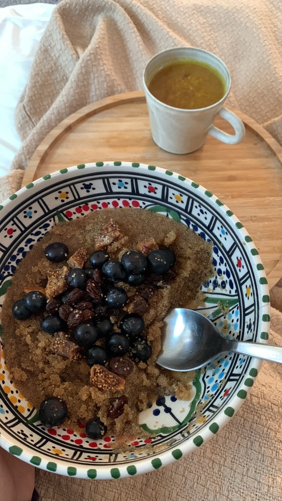 Breakfast in bed (amaranth porridge with fruit & golden milk made with coconut milk & chopped walnuts, prepared by my postpartum doula)
